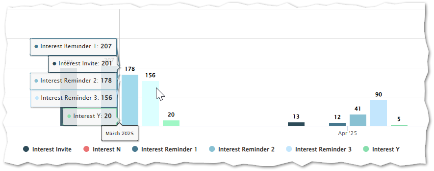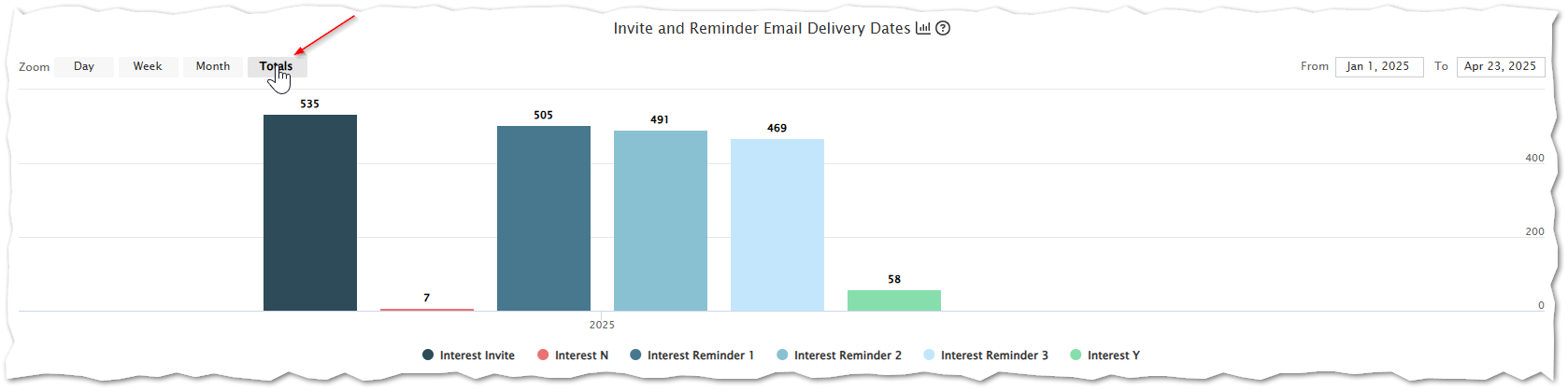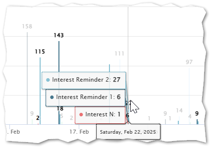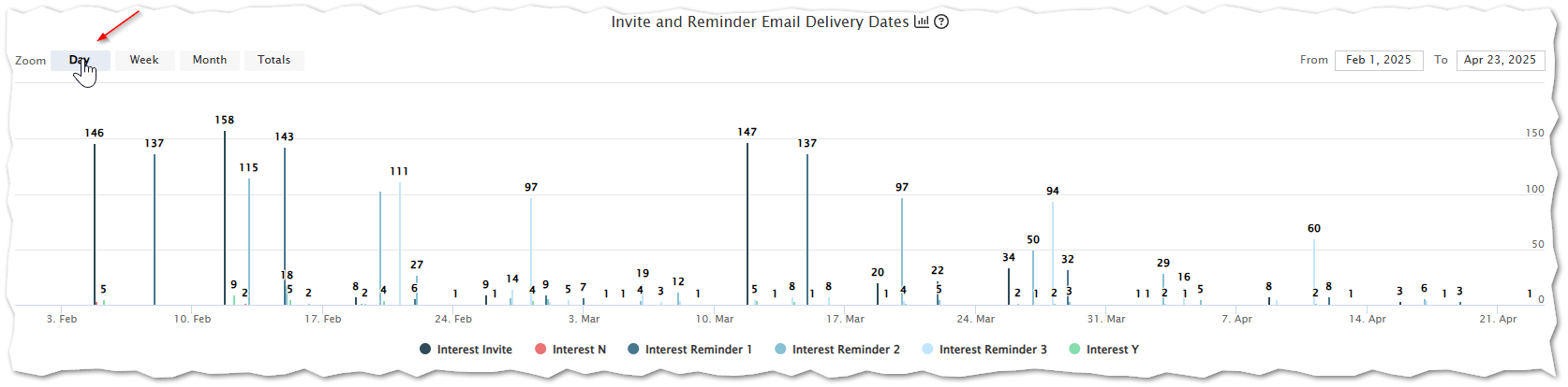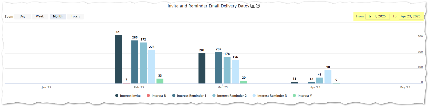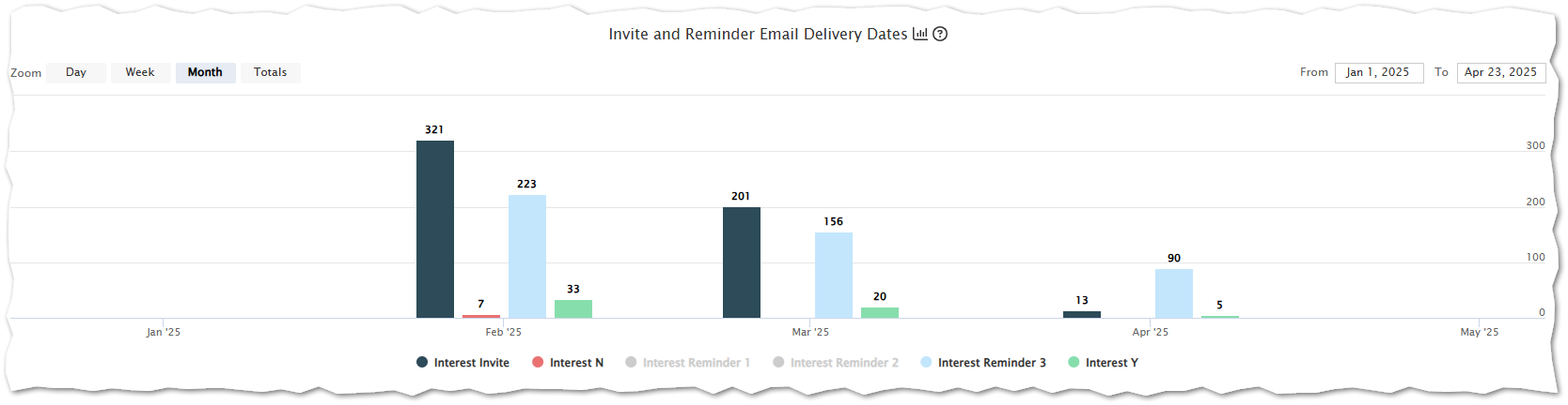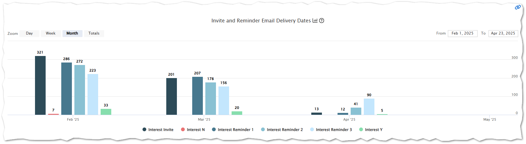 - Hover over a chart element to get detailed information for that time slice - note: by default the timeline chart summarizes data by month, but you can easily change the grouping by clicking on the top left zoom level of: Day, Week, Month, or Totals by Year