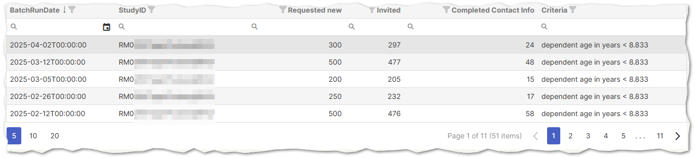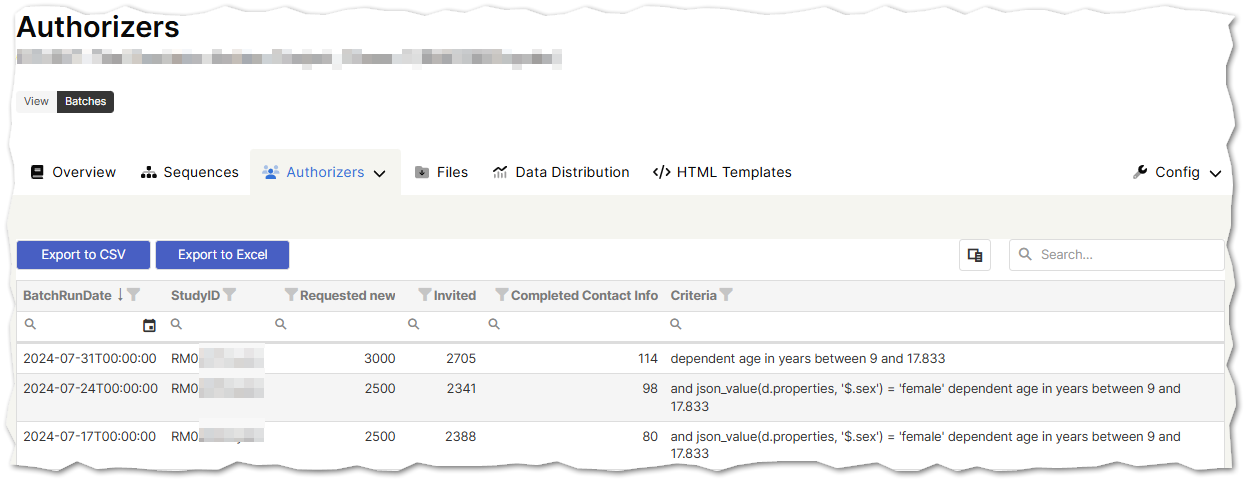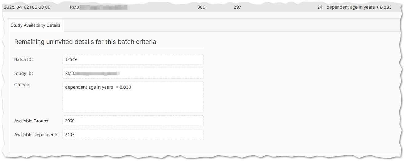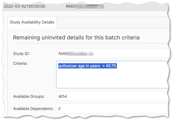 Here you will see the criteria used for that batch request, how many available authorizer groups and how many available dependents in your study are eligible to invite based on that criteria.